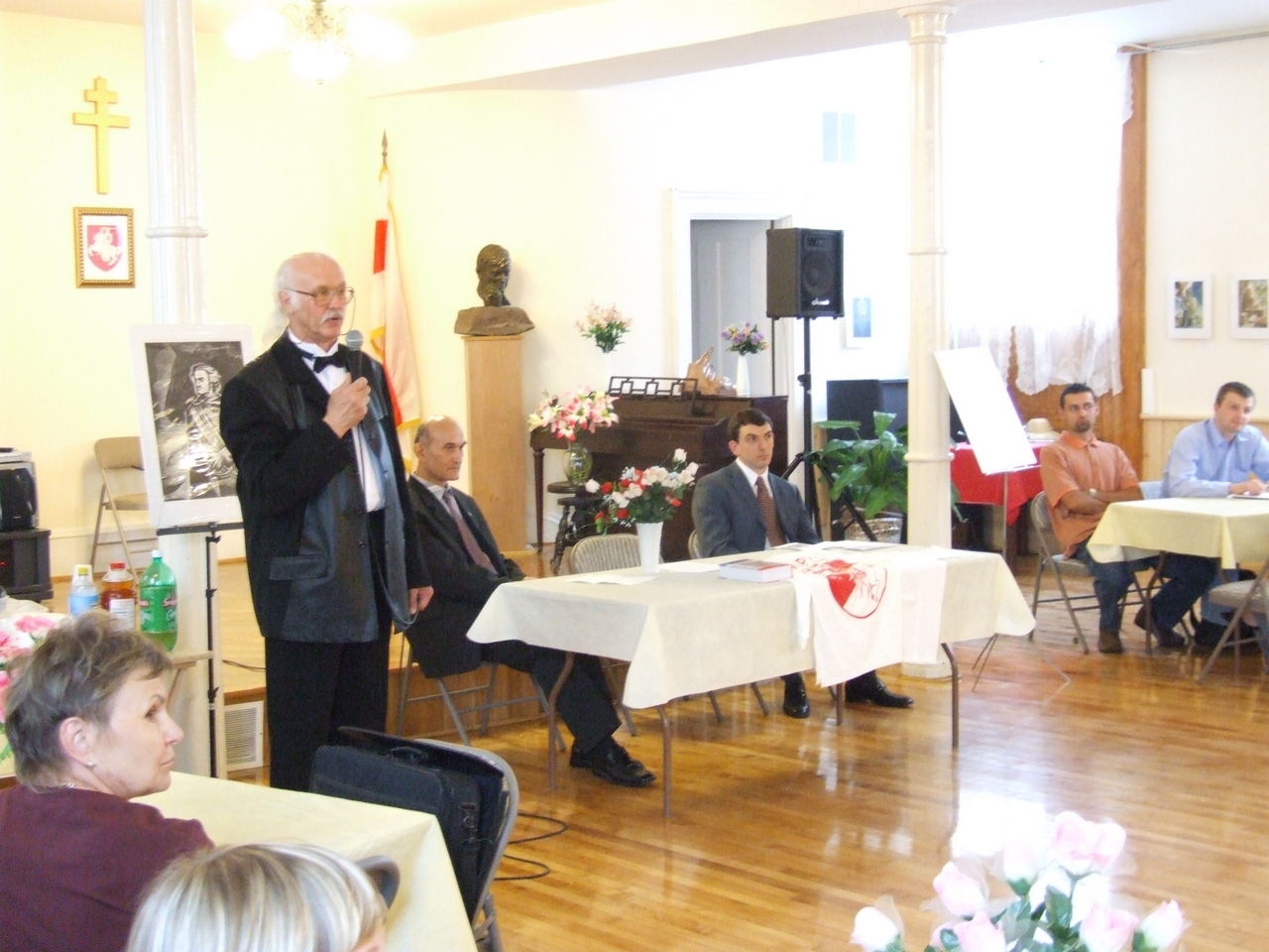 They spoke about history of art development both in Belarus and in Belarusan Diasporas abroad, greeted the artist upon the opening of his exhibition, and presented gifts to the artist. After the latter ceremonies, the artist took a lead in presenting his artwork. Mikalay Saganovich officially presented the gift to the artist on behalf of the Belarusan immigrants. The official opening procedure was completed by Siarzhyk Sokalay-Vojush, who in his turn also greeted the artist and sang the song of Belarusan rebirth.